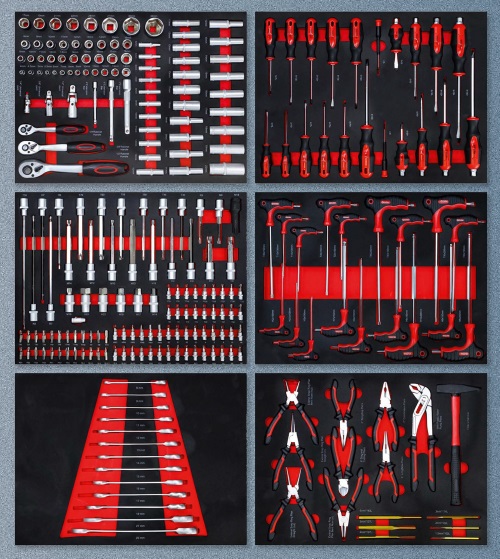 contiene 6 bandejas de espuma blanda con las siguientes herramientas: